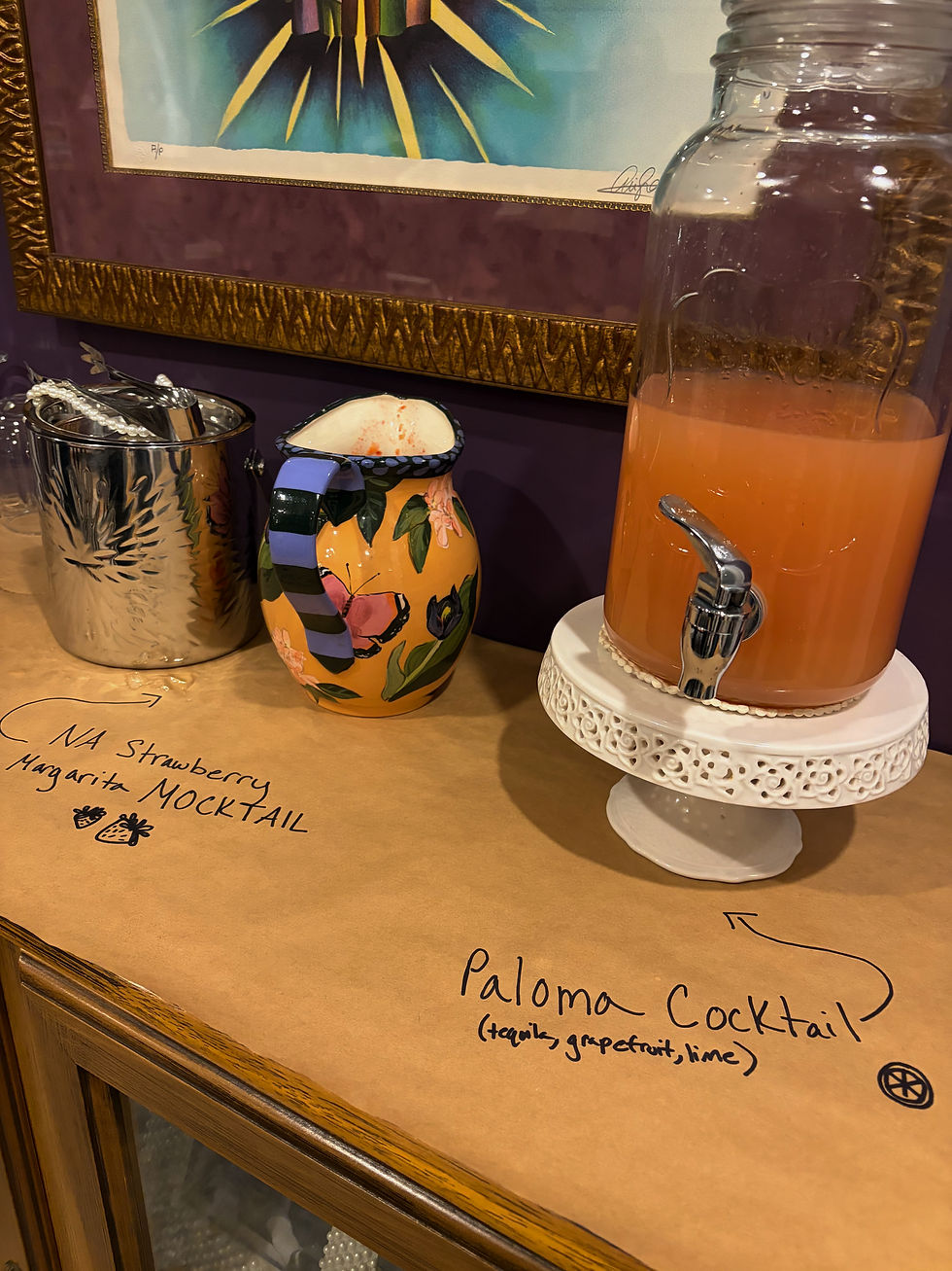 I prepared 14 boxes, added stickers, and Jake displayed them in a pyramid. The dining room table was the center of action. Everyone’s names and cookie contributions were written on a sheet of butcher paper, indicating where to place their treats. We had Palomas and non-alcoholic strawberry margaritas. The setup was intentional, the strings of plastic pearls, bows, ribbons, and pretty glassware produced a detailed girly aesthetic. We built our boxes by circling the table and taking one of each cookie. From chocolate chip to orange zest sugar cookies, we stacked our boxes high and made our way to the living room. Then we sat by the fire, drank our beverages and sampled our treats.